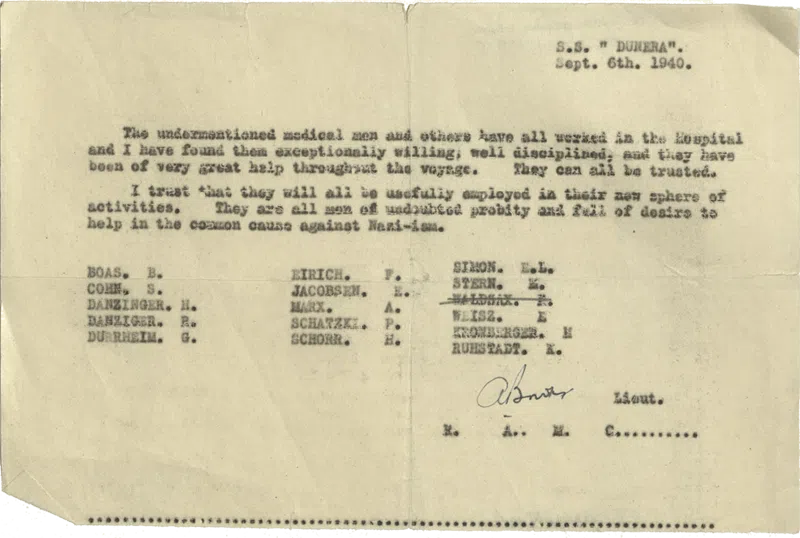 In this letter, military doctor Lieutenant A. Brooks confirmed the valuable assistance he received from internees – doctors and other helpers – in the ship’s hospital during the Dunera’s voyage. It contains a list of 15 names of his helpers. The article about Lieutenant Brooks was supplemented with detailed notes on this. The letter was found in documents from the estate of Dunera boy Friedrich Eirich, which are kept in the German Exile Archive 1933-1945 at the German National Library, Frankfurt am Main.