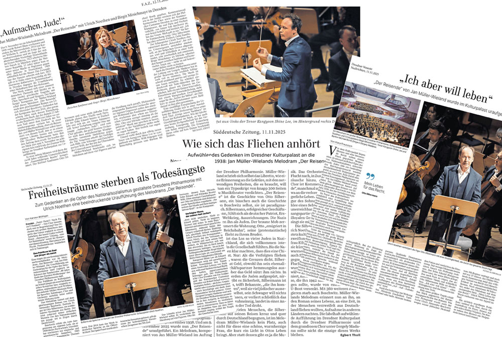 On November 9, 2025, the musical melodrama “Der Reisende” (The Traveler), based on the book by Dunera Boy Ulrich Boschwitz, premiered at the Dresden Philharmonic in the Dresden Kulturpalast. The music and libretto were created by Jan Müller-Wieland. Ulrich Noethen and Birgit Minichmayr appeared as the narrators of the Silbermann couple, while Kangyoon Shine Lee (tenor) and Michael Borth (baritone) appeared on stage as singers. Gergely Madaras conducted.